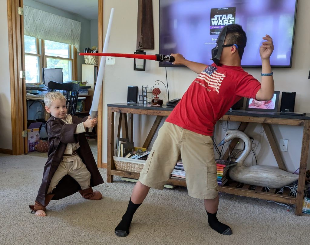 This boy is nine parts imagination for every one part reality. Sometimes he is a baby dragon. He solemnly told Romilly on the phone recently, “The dragons have really been really bad since you left. Mom doesn’t know how to handle them. What should she do?” (She recommended a stern tone, which is apparently not my forte. The dragons are still bad.) Sometimes he is a Star Wars or Wingfeather Saga character, complete with a drumstick light saber or dagger.