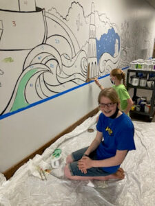 I had the chance to paint at my aunt Chelsea’s church a couple weeks ago. (Actually, I’ve done a lot of painting recently, since my youth group is redoing our room, but that’s beside the point …) Anyway, Chelsea is painting a mural along the hallway, and it’s basically an enormous paint-by-number, so (almost) anyone can pitch in and help.