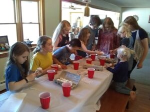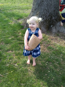 On Easter Day, we had our church service in the parking lot, and Pippa (my only older sibling) was baptized. It was sunny and hard to get a good view, but it was really cool to watch. After church we dropped by our house so some of us could change out of our dresses; then we headed straight to Pop-pop and Debidee’s house for more festivities, including several games which were quite ridiculous and surprisingly fun. The first of these was a relay race wherein the competitors had to wear enormous cardboard bunny feet. Another included three “Easter Bunnies”: people wearing shirts covered with Velcro-ed candy. The younger kids chased them around and stole as much candy as they could grab. I didn’t play, but it was fun to watch, and Miss Freya managed to get an impressively large haul of candy: